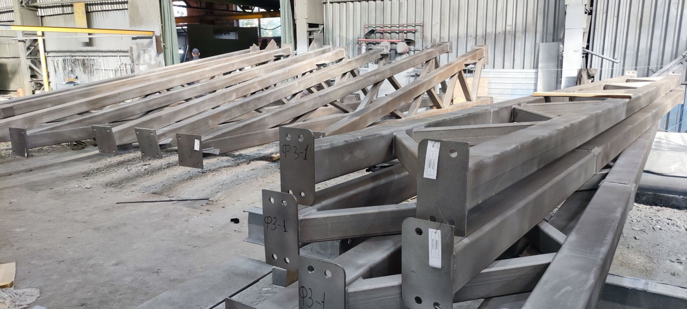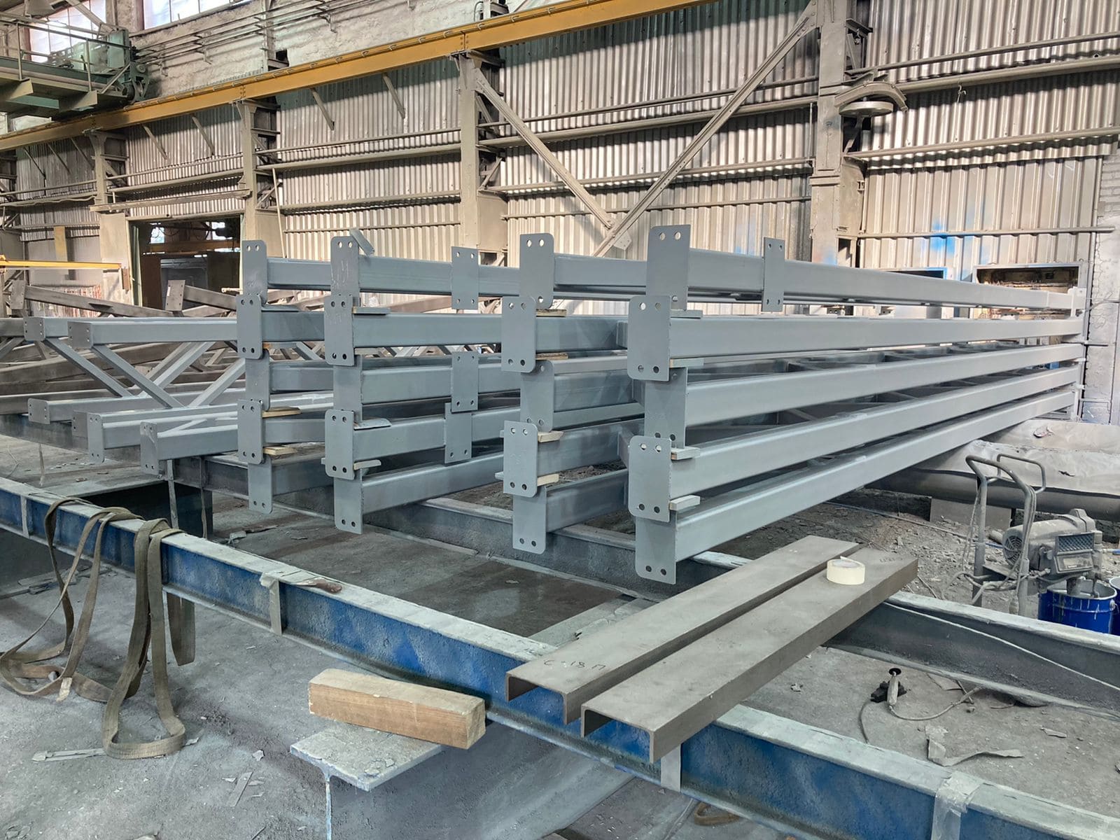 Производим косоуры для лестниц на склад хранения продукции широкого потребления. Конструкция состоит из листового проката, профильных труб, гнутого швеллера. Покрытие – полимерно-порошковое RAL 2008.